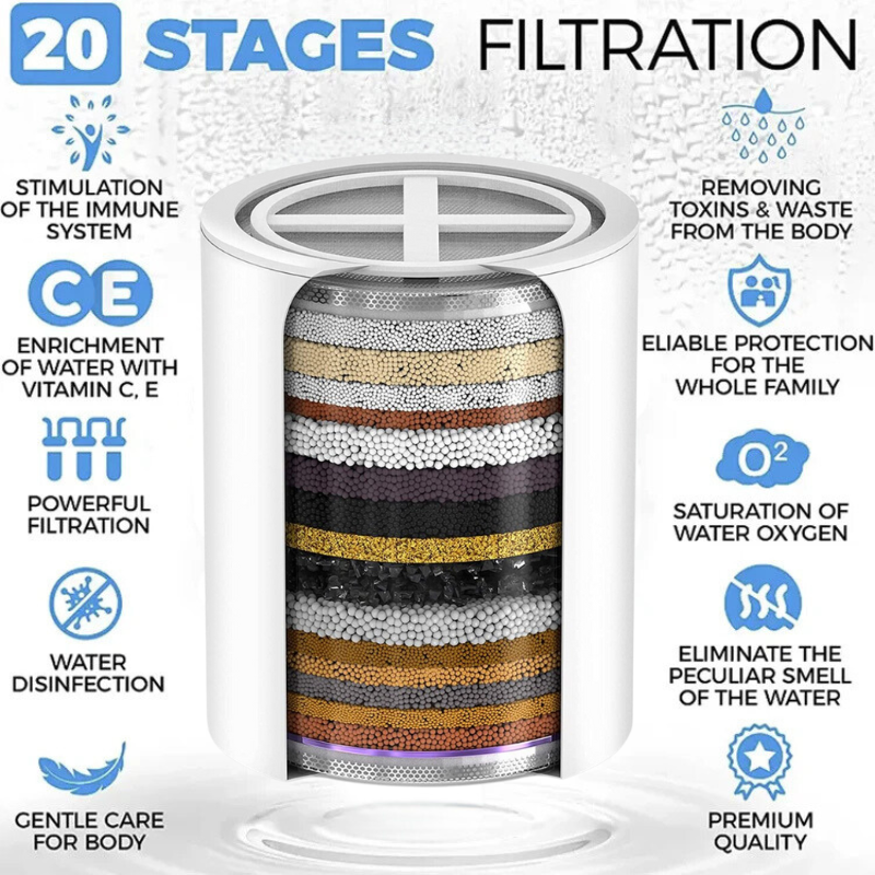 نظام ترشيح مبتكر مكون من 20 مرحلة يتكون من أحجار معدنية أيونية، وABS (أكريلونيتريل بوتادين ستايرين)، وقطن PP، وفيتامين C، وKDF 55، والمزيد لتليين المياه العسيرة وإزالة العناصر غير المرغوب فيها مثل الكلور والبكتيريا والأوساخ والصدأ.